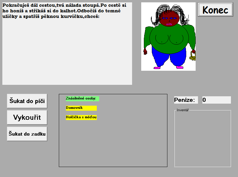 the largest and nastiest of all ZNK games, outdoing the length and brutality of the others by an order of magnitude. you play as Jarda Klečař, a drunkard, who, in a total alcoholic stupor, bets his brother a bottle of rum that he can kill 6 people in 6 days. the following days consist of his insane stumblings as each day, a strange force hints at his next victim. largely considered the best ZNK game. |