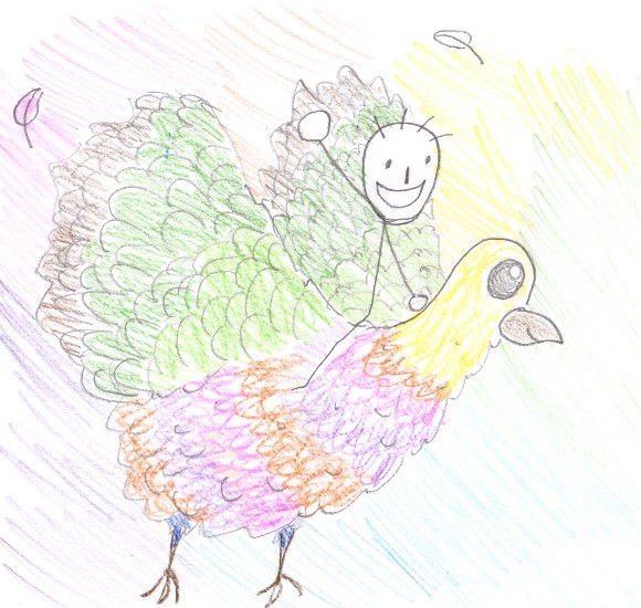 And the bird took you up, up, and up, higher than any place you have seen. From the top of the world, holding you tight, he jumped, and the wind swirled through your hair, and you yelled in joy. And like this, you flew and flew... gathering all these sights made you emotional, you tear up, and the bird makes a soft giggle-like sound. Before you know it, you are home in your bed! Was it a dream? You grasp a tiny feather in your hand.. YOu hear the flapping of wings outside the window. You smile :).
